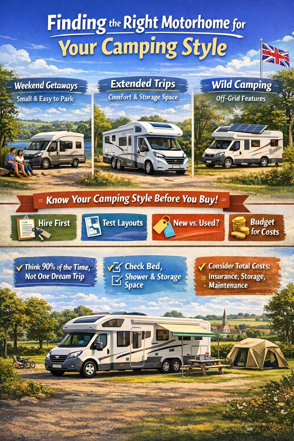 Start by hiring different motorhome types. A weekend in a compact van conversion followed by a week in a family coach-built teaches you more than hours of research. Many dealers offer try-before-you-buy schemes, deducting hire costs from eventual purchases.