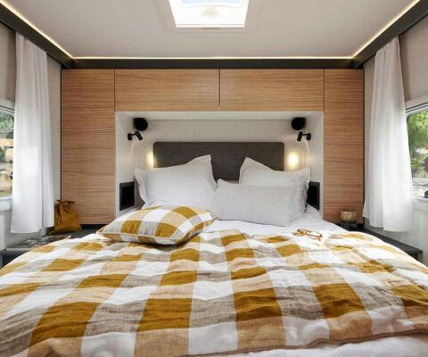 Two large bench seats face each other in this beautifully finished living room. In the centre, a large folding table seats 5. The elegance of the wood, the large windows and the numerous LED lights all contribute to the warm ambience of this beautiful living space. Compatible with ALDE heating, it will allow you to travel in any season.