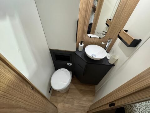 Two large bench seats face each other in this beautifully finished living room. In the centre, a large folding table seats 5. The elegance of the wood, the large windows and the numerous LED lights all contribute to the warm ambience of this beautiful living space. Compatible with ALDE heating, it will allow you to travel in any season.