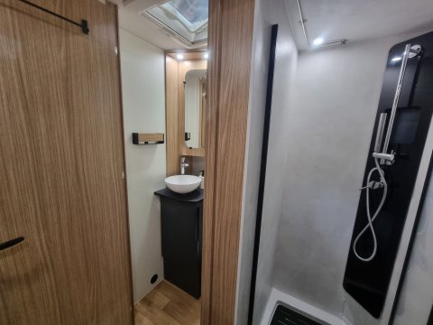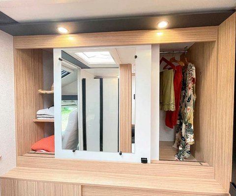 The walk-in wardrobe, located between the cabin and the lounge, is ideal for storing your clothes and belongings. Equipped with a large mirror, it also has a wardrobe and various drawers directly accessible from the shower room, for added practicality. Access to the cargo area is just below the dressing room.