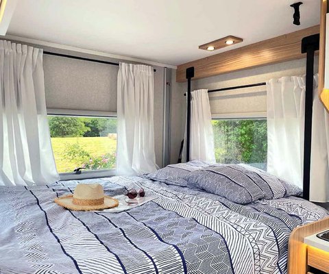 The sleeping area consists of a large XXL drop-down bed 160x200cm. Well thought out, the placement of the TV arm allows you to watch it from the comfort of your bed. A bed in the living room can accommodate 2 additional travelers since the P696U is also equipped for 4 vehicle registration seats.