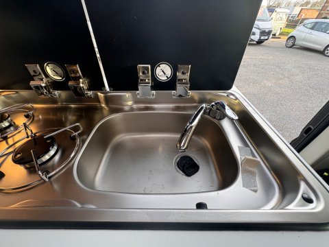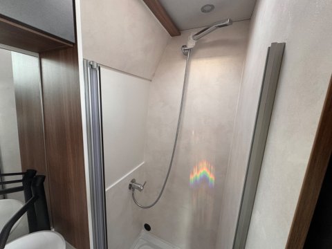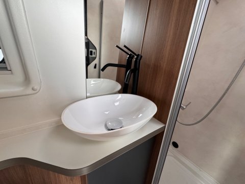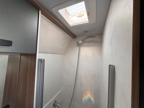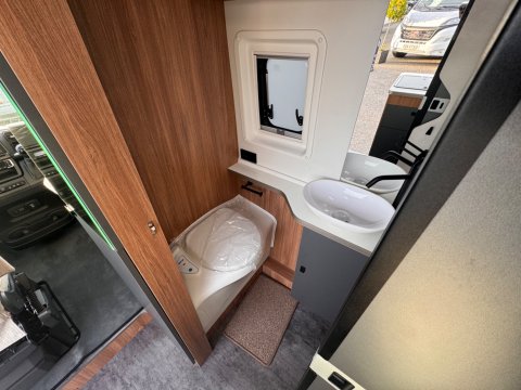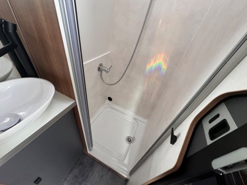 Opposite the kitchen, you’ll find the washroom, which is pretty well-appointed, too. There’s a shower cubicle to one side and on the other there’s a Thetford toilet, while a washbasin with mixer tap is positioned centrally with storage space below. There’s LED lighting throughout and ventilation is courtesy of two rooflights with flyscreens.