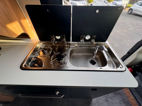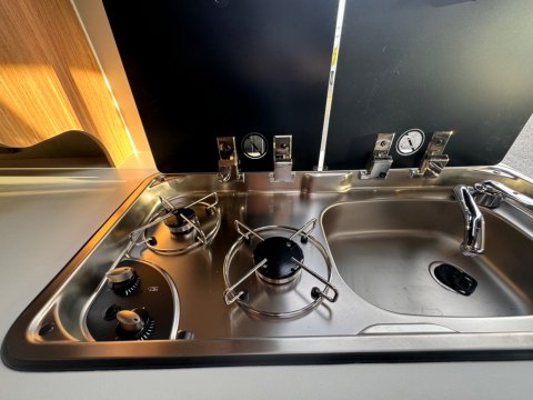Included is a well-appointed kitchen. On the Continent, kitchen set-ups are often quite basic because campers tend to prefer to cook outside. That’s possible over here as well, of course, if you only camp in summer but, for those seeking year-round use out of their campervan, you’ll no doubt be grateful for the oven and grill here, plus a three-burner hob and adjacent stainless-steel sink, and a fridge/freezer.