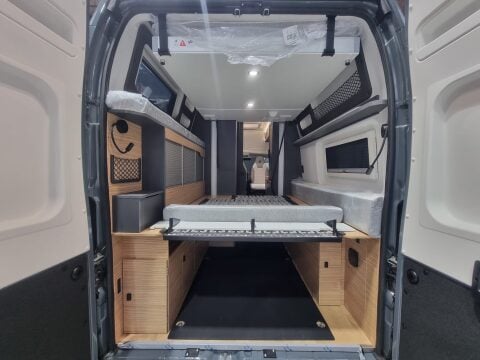 The Pilote V633M is the tallest and most modular converted van, offering a spacious interior and great adaptability. Whether you want to explore city centers or venture off the beaten path, this compact vehicle will accompany you everywhere. Choose a converted van that provides you with an unlimited travel experience. The V633M panel van is the tallest and most flexible van from the Pilote brand. You will appreciate its functional kitchen divided into 5 drawers with integrated waste bin. The practical and ergonomic 3-in-1 bathroom gives you space to move. Its electric drop-down bed offers a pleasant space for sleeping. The maximum cargo hold capacity that will allow you to store everything you need, even a motorcycle.