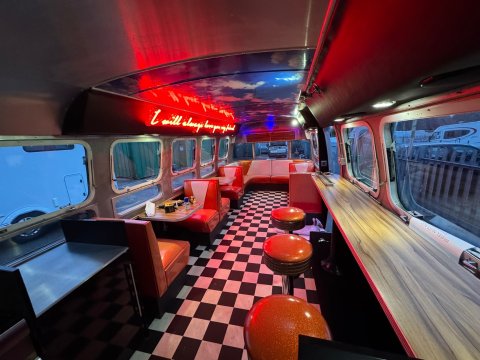 This Original Airstream Diner has seating to dine in , a bar area and a rear serving hatch to enhance the opportunity to serve larger crowd from outside , it also boasts of a full stainless steel catering kitchen , 6 burner range cooker , Salamander, deep fat fryer, fridge and freezer , hot water system and twin sinks .