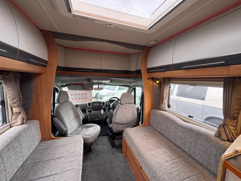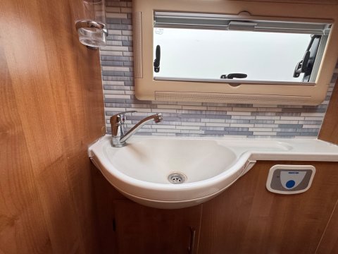 The motorhome boasts a well-equipped L-shaped central kitchen with an oven and grill, one electric hotplate, three gas hobs, microwave, sink and a 3-way fridge/freezer.