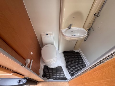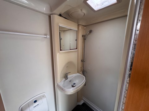 The washroom is a corner unit with cassette toilet and electric flush, a washbasin and a shower cubicle.