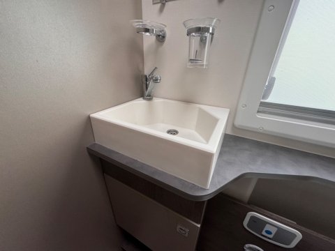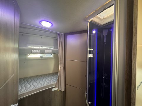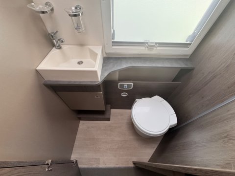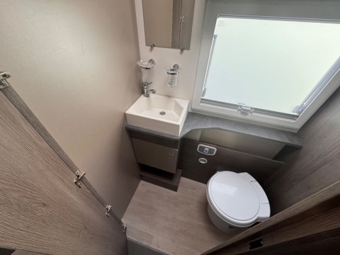 A full-width washroom is located at the rear, featuring a separate shower cubicle,electric flush cassette toilet, and wash basin.