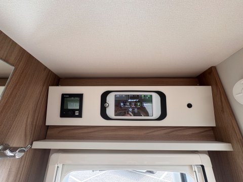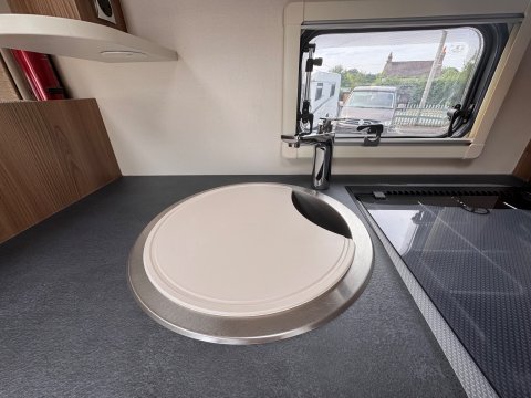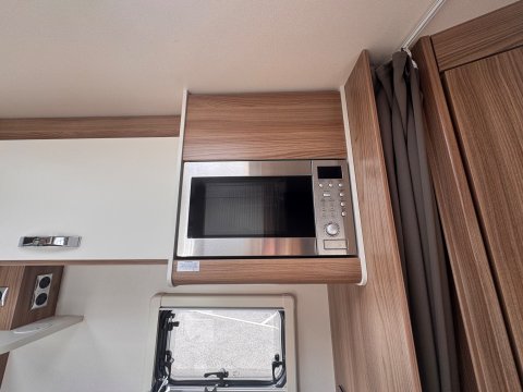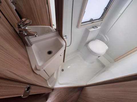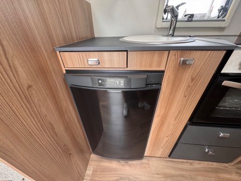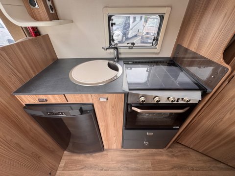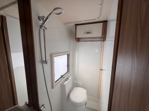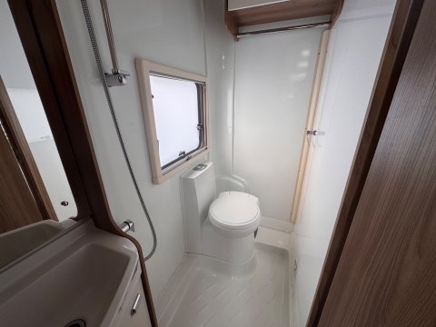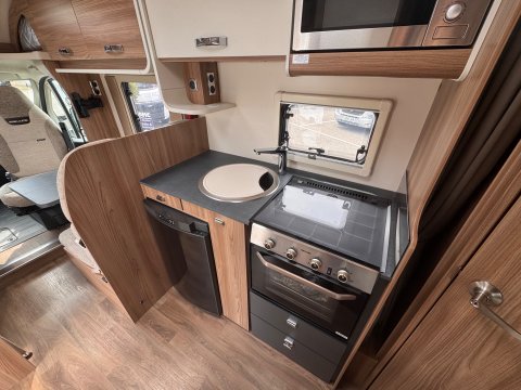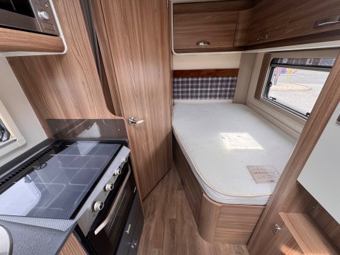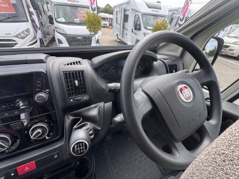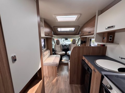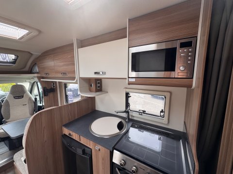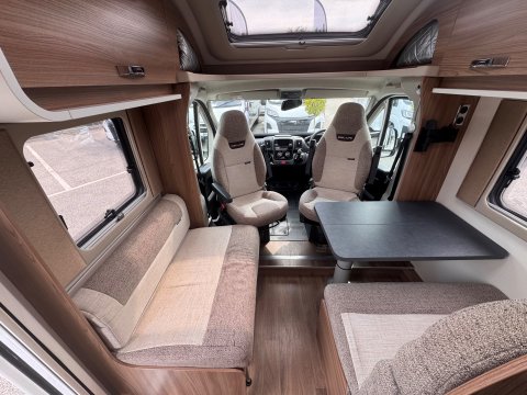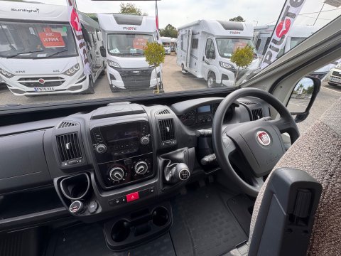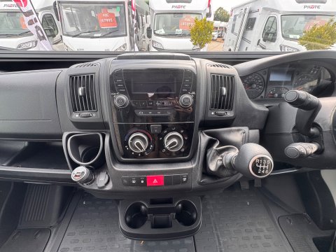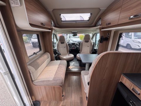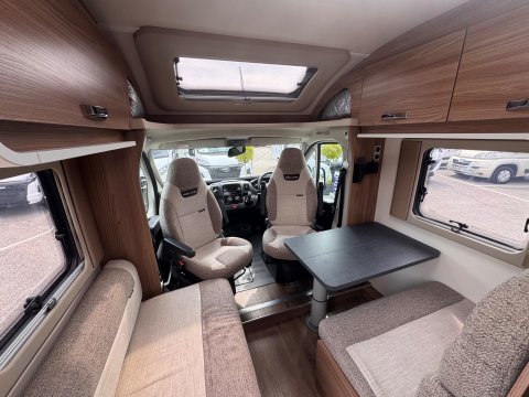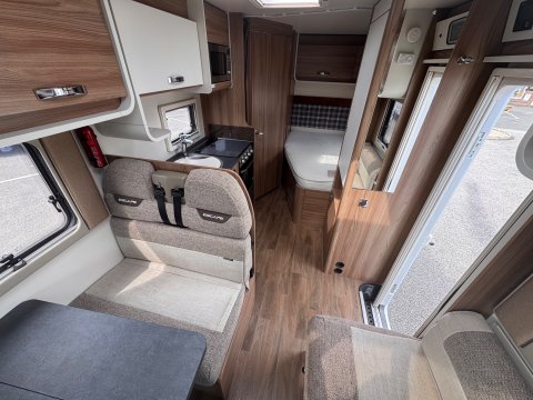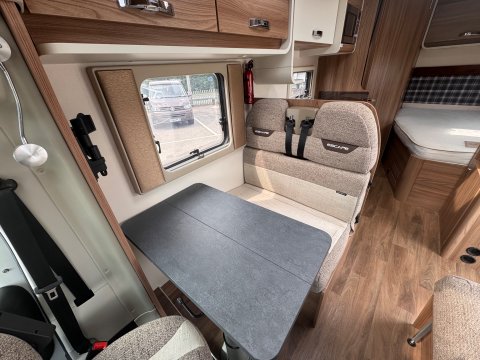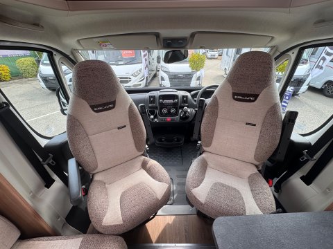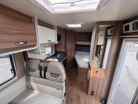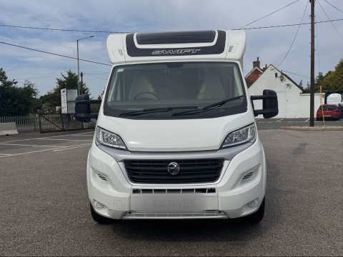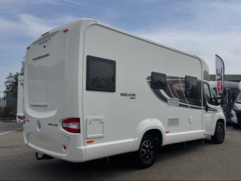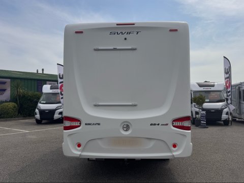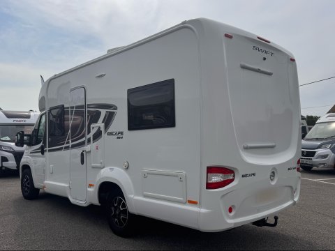 The 2021 Swift Escape 664 is a 4 berth motorhome suitable for families or couples. It features a popular fixed French double bed layout with a full washroom and a spacious front lounge that converts to a second double bed. The motorhome has a stylish exterior graphics and alloy wheels.