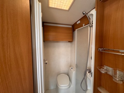Adjacent to the rear fixed bed is a well-sized washroom with an electric flush cassette toilet and integrated washbasin, as well as a shower area.