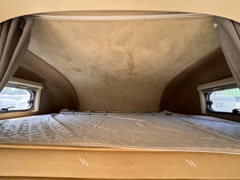 This high-line motorhome can sleep up to six people, with a fixed corner double bed in the rear and a large double bed over the cab. The lounge area, consisting of two large bench seats, can also be converted into a third double bed.