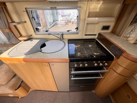 The centrally located kitchen features an oven, separate grill, hob with an electric hotplate, and a microwave. A large 3-way fridge with an integrated freezer provides ample food storage.